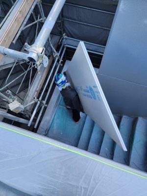 石膏ボードは見た目以上に重量があり、サイズも大きく取り回しに注意が必要な資材です。今回の現場では、外部足場を使って2階部分へボードを搬入。下から上へ渡す際には、互いのタイミングをしっかり合わせて声を掛け合いながら慎重に作業しました。