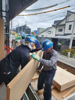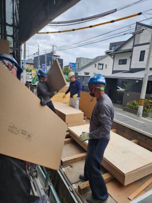 東大阪市の現場にて、木材の荷揚げ作業を行いました。