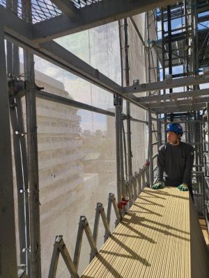 今回の現場では、高層階への搬入が必要だったため、屋外に設置された昇降リフトを使用しました。写真のように、仮設のリフトに資材を積み込み、上階まで安全に運搬。