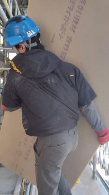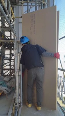 今回は東大阪市の工事現場で、大型の石膏ボードをリフトで上階へ運搬。その後、建物内へスムーズに搬入しました。